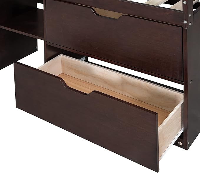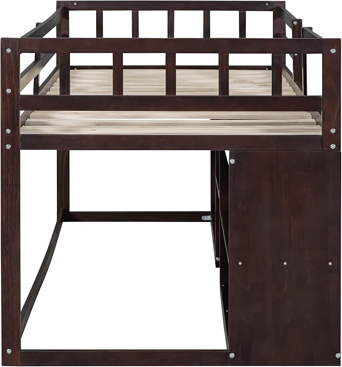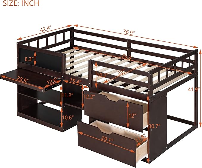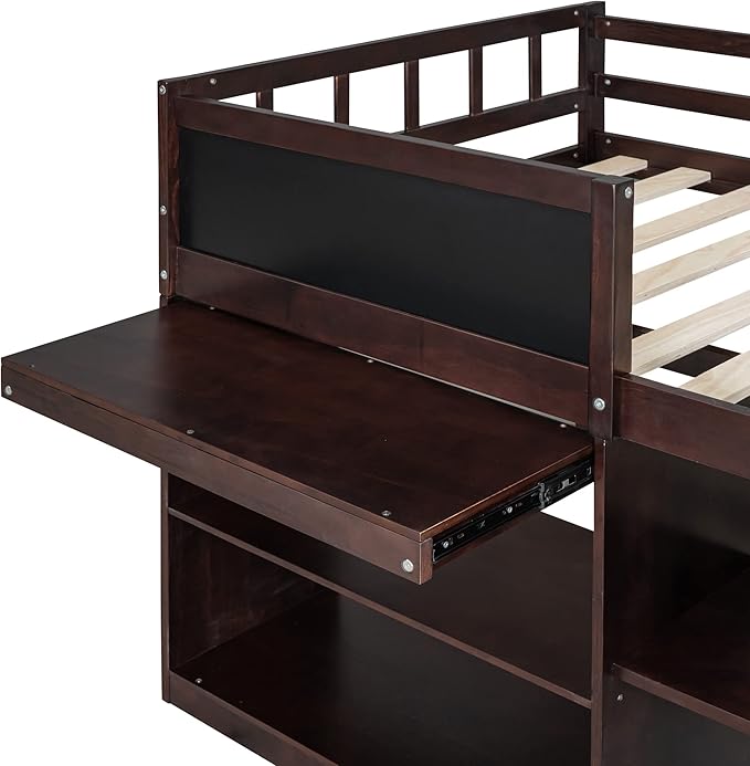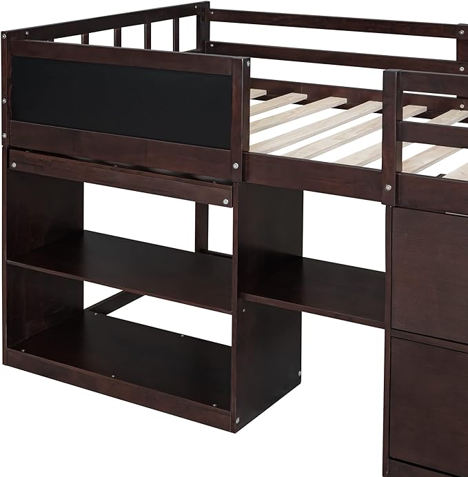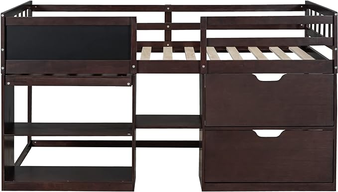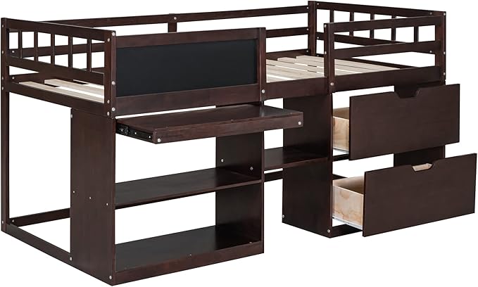 Loft Bed Frame, Twin Size Low Loft Bed with Small Rolling Desk, Chalkboard, 2 Shelves and 2 Storage Drawers for Kids Boys Girls Teens Bedroom, Space Saving Design, Espresso
