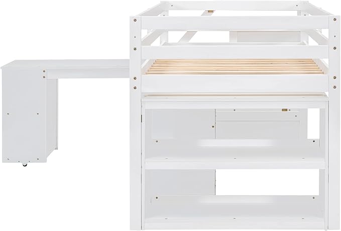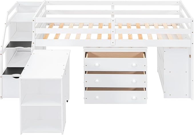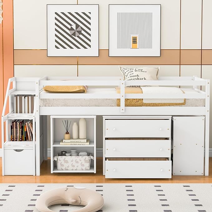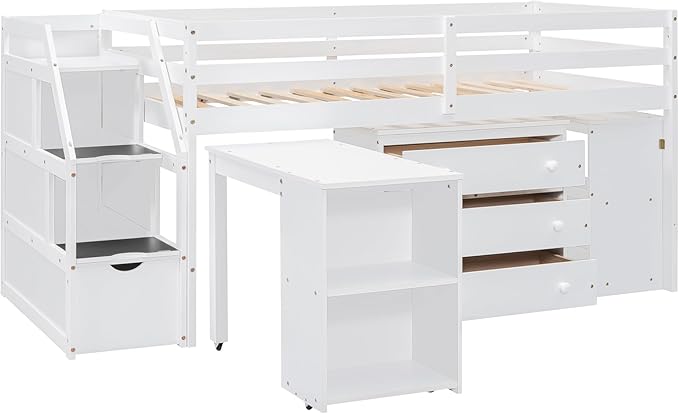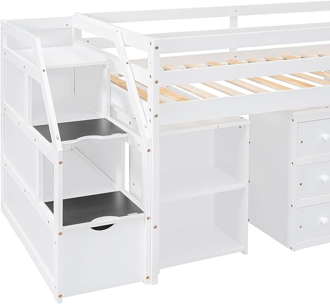 Loft Bed Frame, Twin Size Low Loft Bed with Storage Stairs, Shelves, Retractable Writing Desk and 3 Drawers, Wooden Twin Lofbed Frame for Kids Boys Girls Bedroom, Space-Saving Design, White
