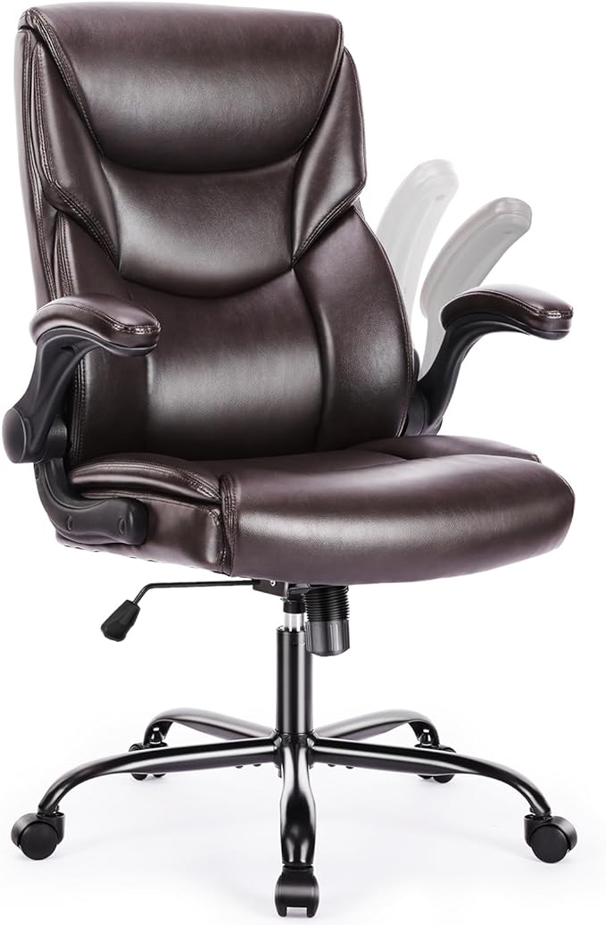 Office Chair - Ergonomic Executive Computer Desk Chairs with Adjustable Flip-up Armrest, Swivel Task Chair with Lumbar Support, Strong Metal Base, PU Leather, Brown