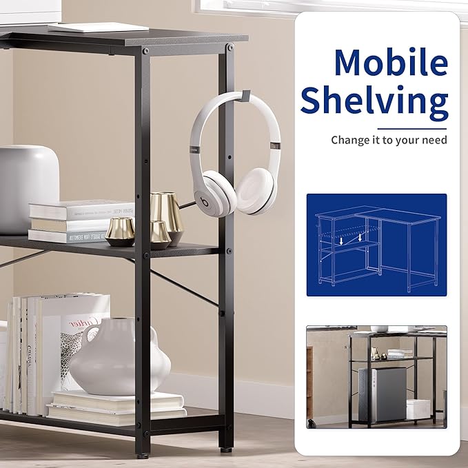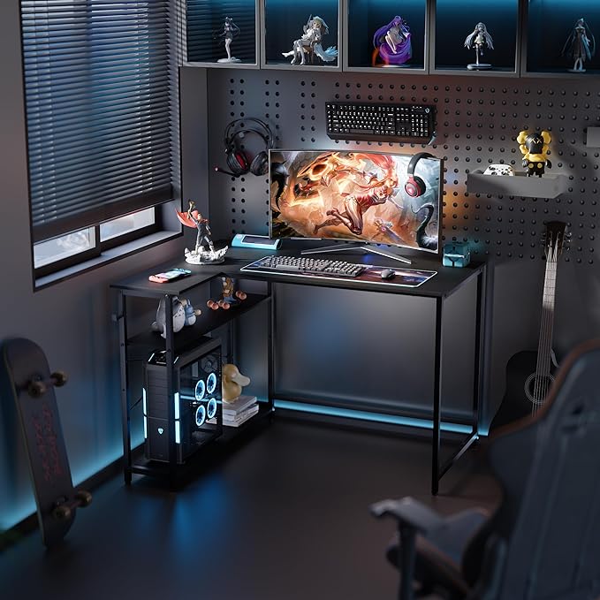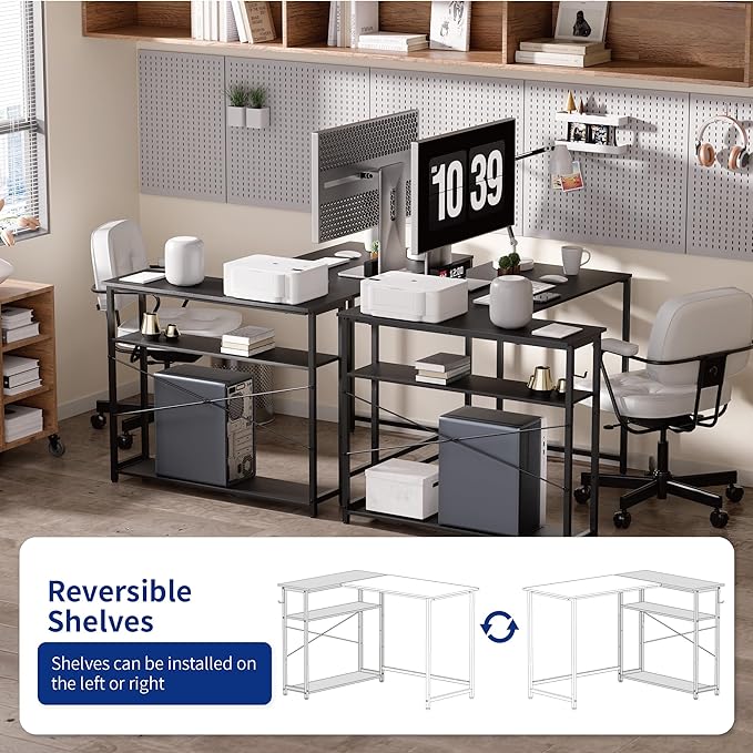 Pamray 43 Inch L Shaped Computer Desk with Reversible Side Storage Shelves, Small Corner Desk for Small Space Home Office,Writing Study Table Gaming PC Desk for Bedroom,Black