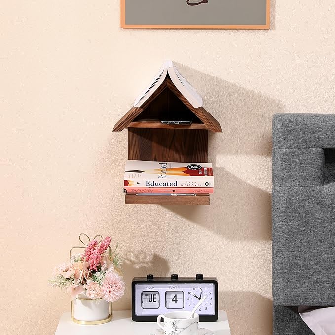 Floating Bedside Wood Bookshelf, Triangle Book Page Holder, Wooden Simple Bookcase for Bedroom Nightstand Library Office or Wall Decor Storage (Brown