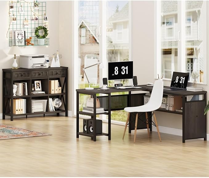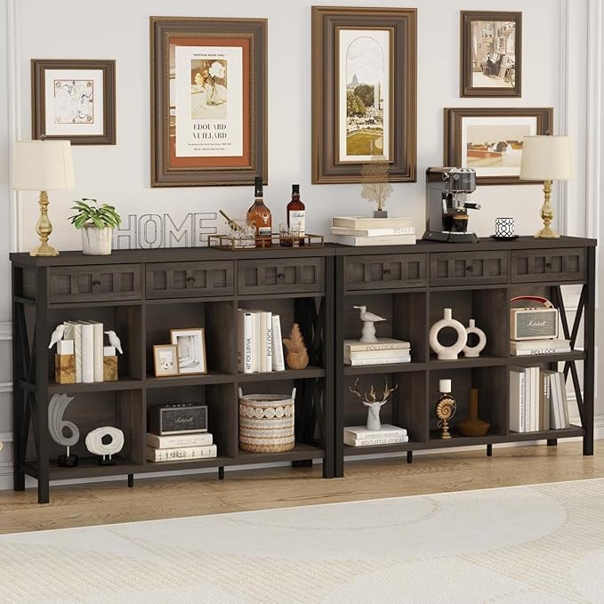FATORRI Rustic 6 Cube Storage Organizer Shelf with 3 Drawers, Long Horizontal Bookshelf, Industrial Wood and Metal Cubby Bookcase (Walnut Brown, 47 Inch)