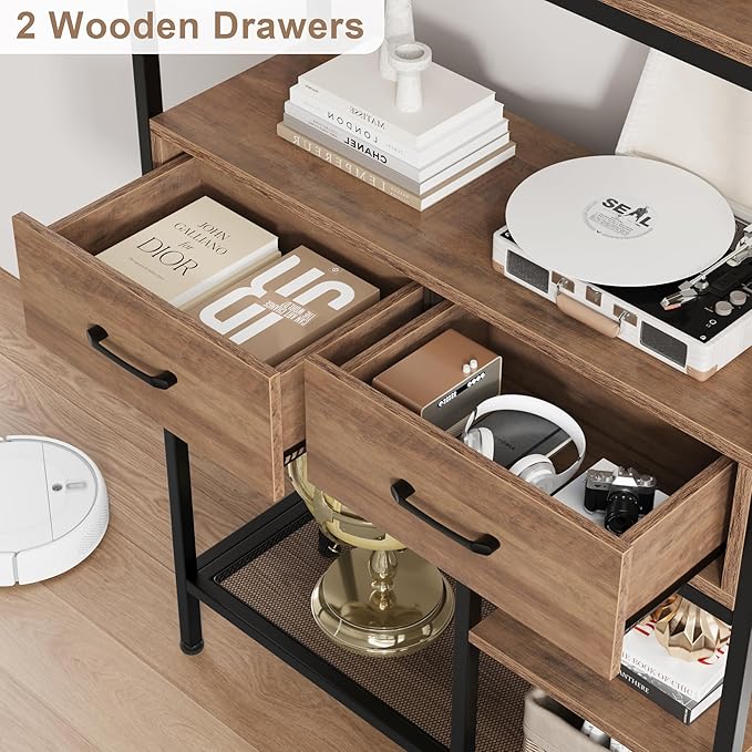 Book Shelf, Tall Bookcase with Storage, 6-Tier Industrial Bookshelf with 2 Wooden Drawers for Home Office and Living Room, Brown