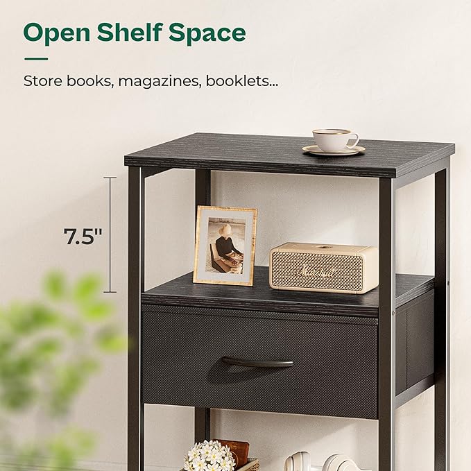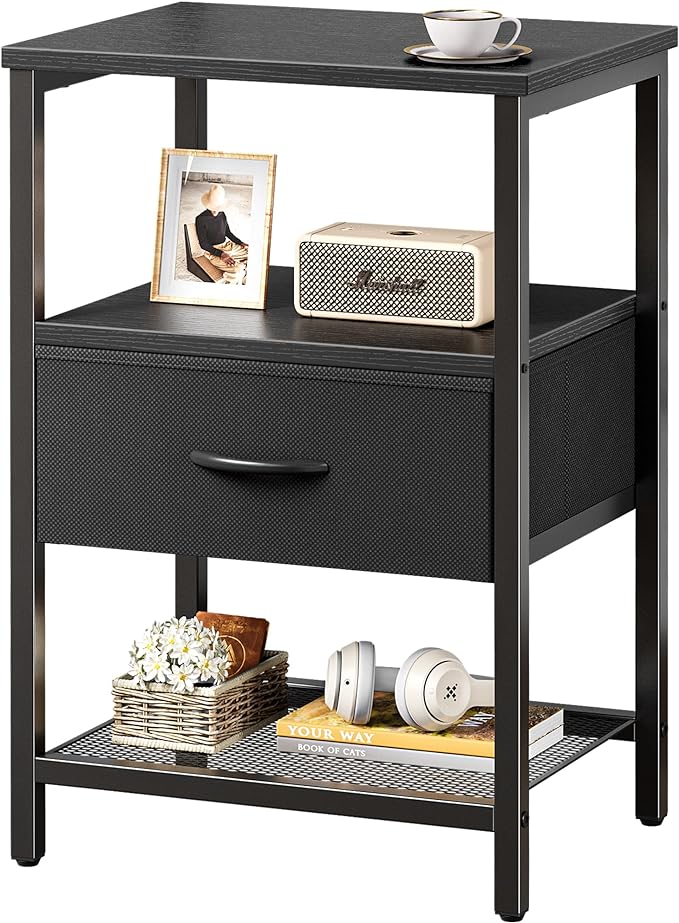 Night Stand with Fabric Drawer, Side Table with Mesh Shelf, Bedroom Nightstand, Fabric Drawer Dresser, Open Shelf, Metal Frame, Couch Side, Black