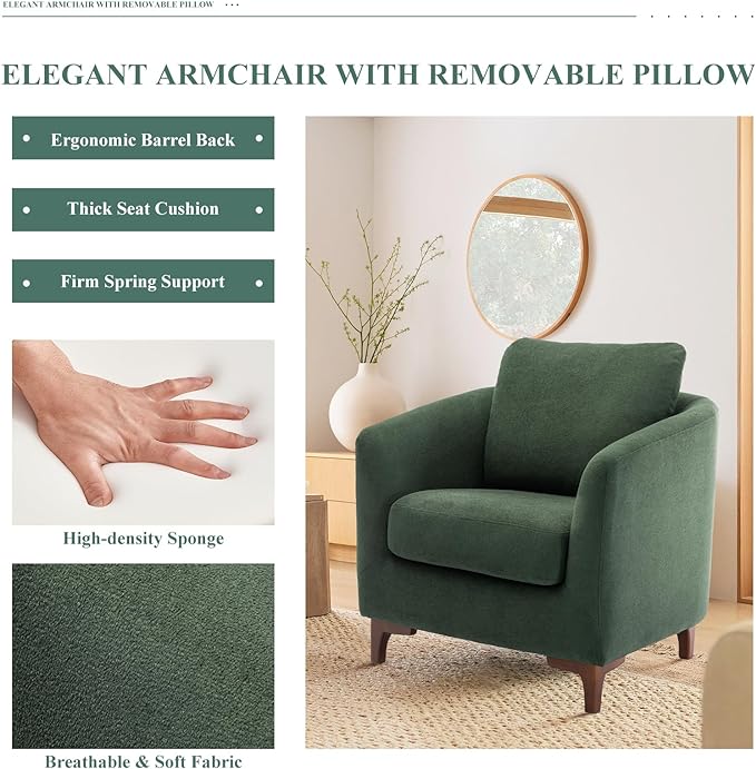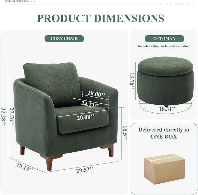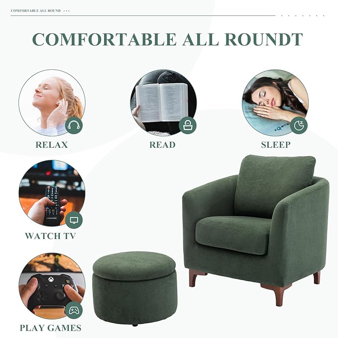 COLAMY Sherpa Accent Chair with Storage Ottoman Set of 2, Upholstered Barrel Arm Chair with Footrest, Modern Living Room Chair with Back Pillow, Green
