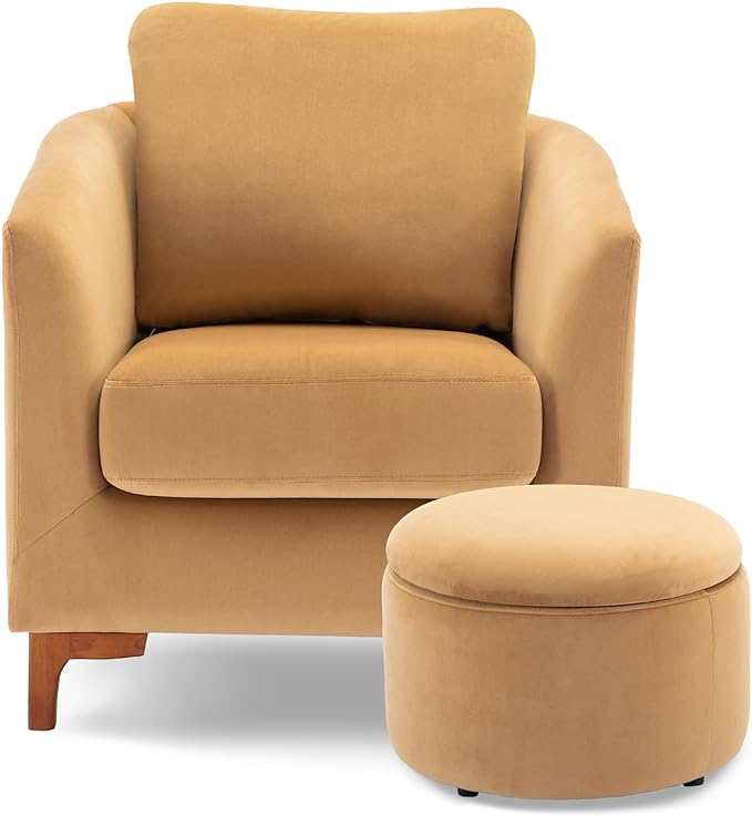 COLAMY Velvet Accent Chair with Storage Ottoman Set of 2, Upholstered Barrel Arm Chair with Footrest, Modern Living Room Chair with Back Pillow, Cream