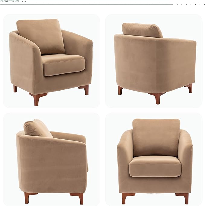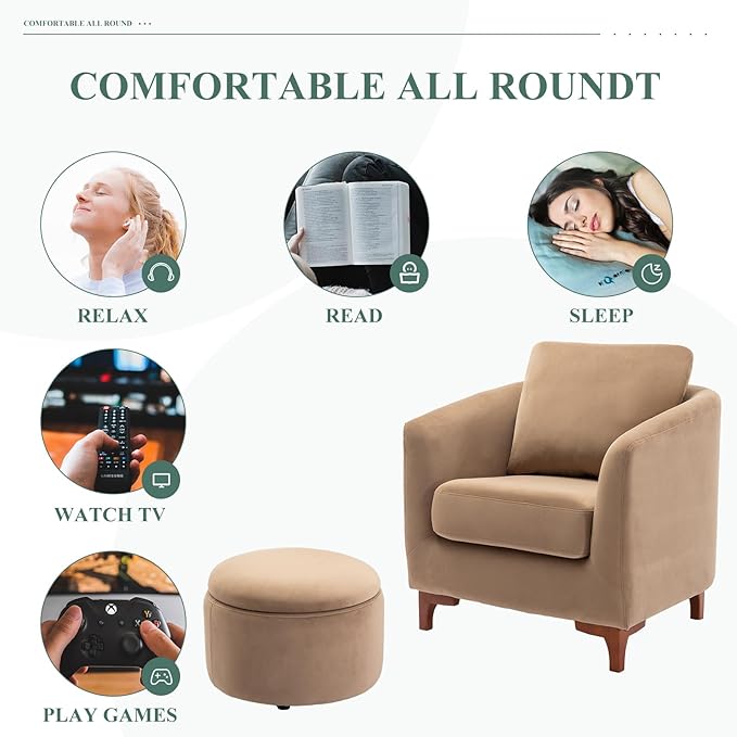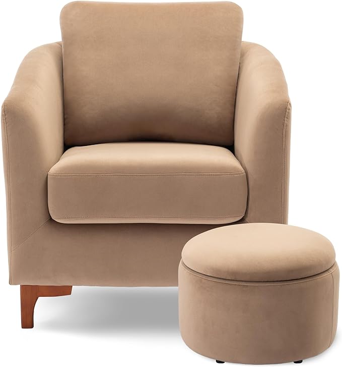 COLAMY Velvet Accent Chair with Storage Ottoman Set of 2, Upholstered Barrel Arm Chair with Footrest, Modern Living Room Chair with Back Pillow, Camel