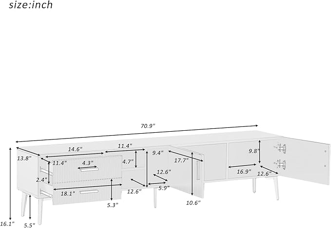 71 Inch TV Stand, Modern Television Stands with Drawers, Cabinets and Open Shelf, Entertainment Center with 5 Champagne Legs for Living Room and Bedroom, White+Gold