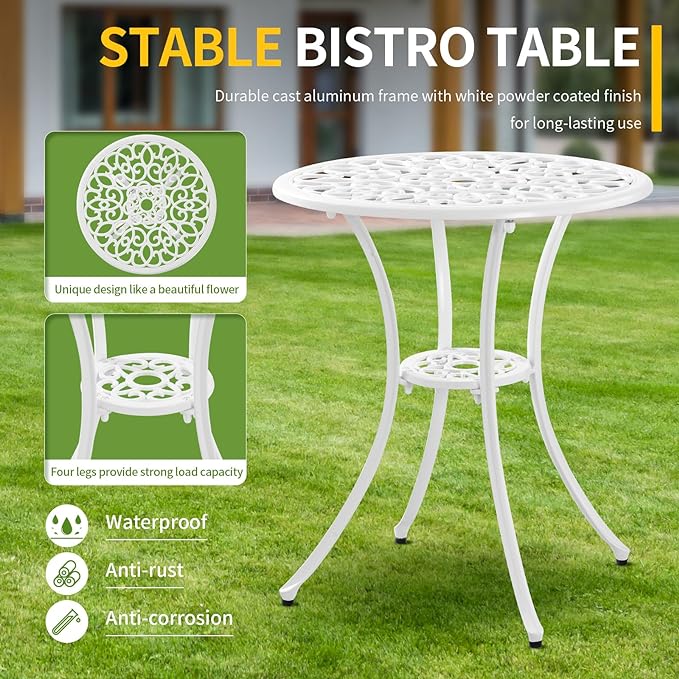 Patio Bistro Sets, Cast Aluminum Bistro Table and Chairs Set of 2 with Umbrella Hole, Bistro Set 3 Piece Outdoor, Metal Patio Furniture Set for Garden Porch, White