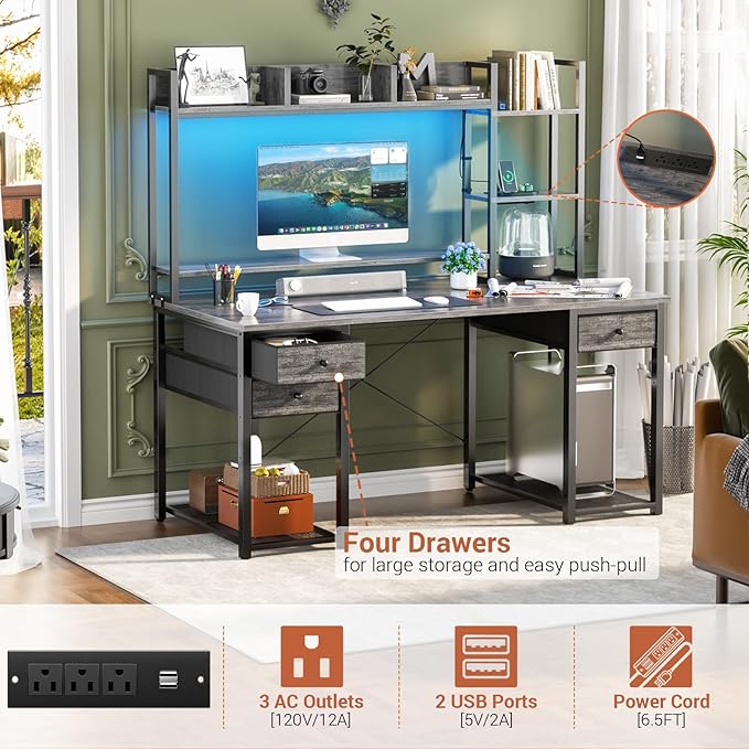 Aheaplus Desk with LED and Outlets, Gaming Desk with Hutch, 47.2'' Computer Desk with Drawers, Reversible office desk with storage bookshelf Large Workstation Desk with Shelf, Desk for Home, Black Oak