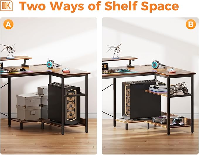 ODK 40 Inch Gaming Desk with USB Charging Ports and LED Lights, Reversible L Shaped Computer Desk with Storage Shelves & Monitor Stand, Corner Home Office Desk Table with Power Outlets, Vintage
