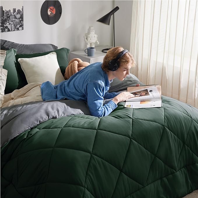 Bedsure Forest Green Twin XL Comforter Set - 5 Pieces Reversible Twin XL Bed in a Bag for College, Extra Long Twin Bed Set Forest Green and Grey with Comforters, Sheets, Pillowcase & Sham
