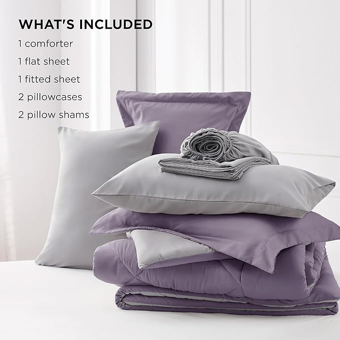 Bedsure Grayish Purple Queen Comforter Set - 7 Pieces Reversible Queen Bed in a Bag, Queen Bed Set Grayish Purple and Grey with Comforters, Sheets, Pillowcases & Shams