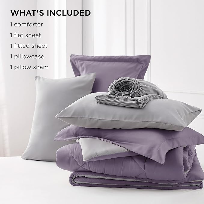 Bedsure Grayish Purple Twin Comforter Set - 5 Pieces Reversible Twin Bed in a Bag, Extra Long Twin Bed Set Grayish Purple and Grey with Comforters, Sheets, Pillowcase & Sham