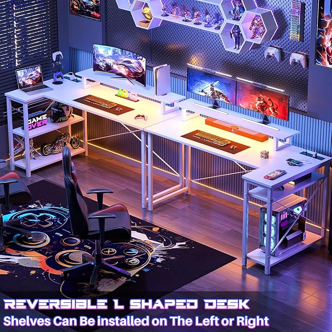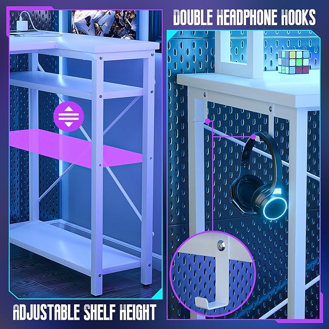 Homieasy L Shaped Gaming Desk with Power Outlet & LED Light, 55 Inch Computer Desk with Storage Shelves, Reversible Corner Desk with Monitor Stand Headset Hooks for Home Office, White