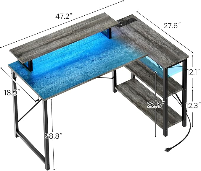 Homieasy L Shaped Gaming Desk with Power Outlet & LED Light, 47 Inch Computer Desk with Storage Shelves, Reversible Corner Desk with Monitor Stand Headset Hooks for Home Office, Black Oak
