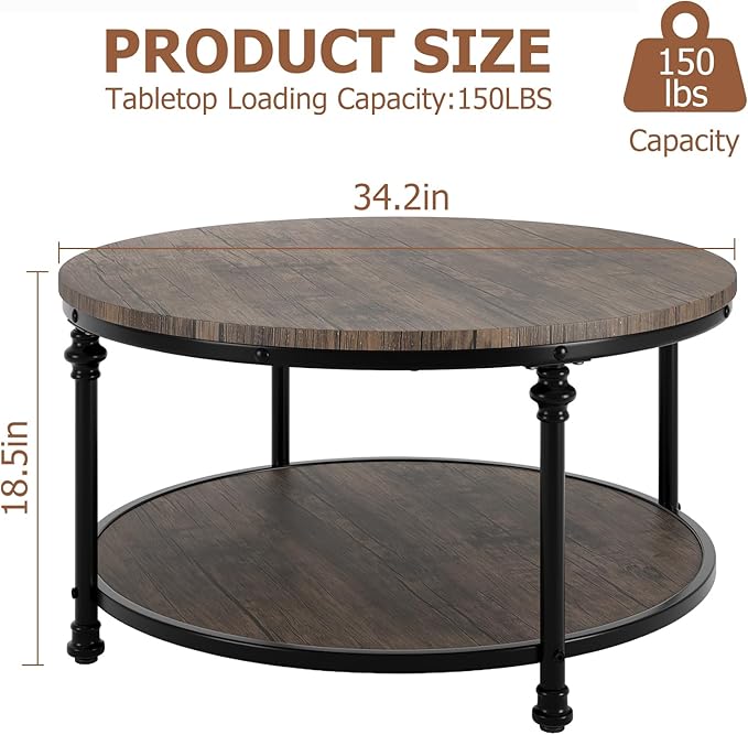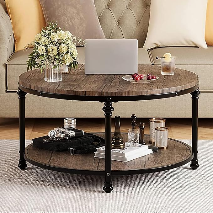 GAOMON Round Coffee Table Rustic Center Table with Storage Shelf 2-Tier Industrial Accent Center Table Wood Circle Coffee Table with Sturdy Metal Legs, Easy Assembly