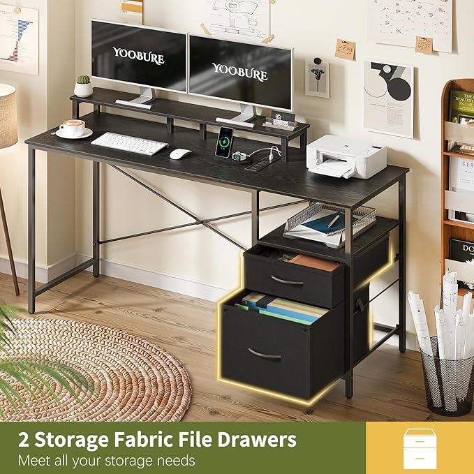 Yoobure Computer Desk, Gaming Desk with LED Lights & Power Outlets, Office Desk with Fabric File Cabinets, 55.1" Gaming Table with Long Monitor Stand, PC Gamer Desk with Drawers for Home office, Black