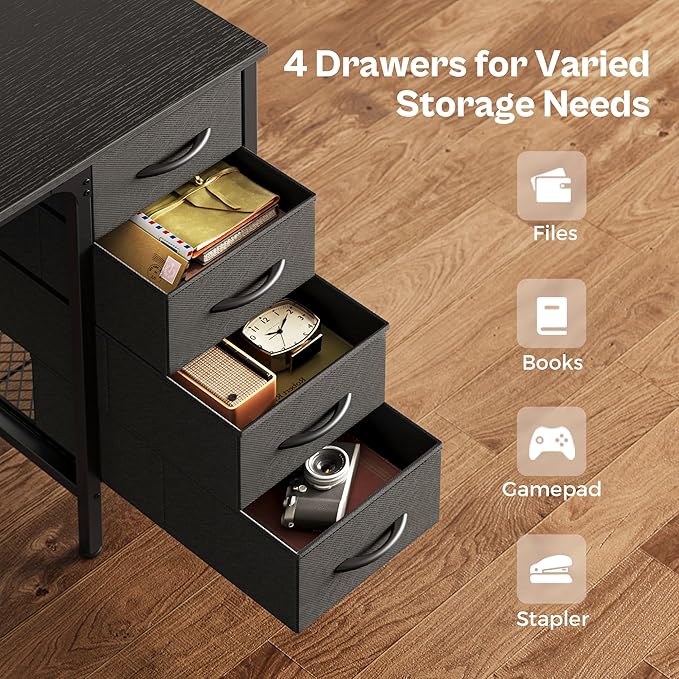47 Inch Computer Desk with 4 Drawers, Office Desk with Mesh Shelf, Gaming Desk, Large Storage, Writing Desk Work Desk for Home Office, Study, Bedroom, Work from Home, Black