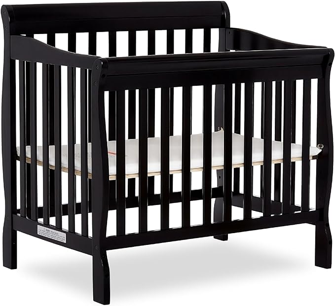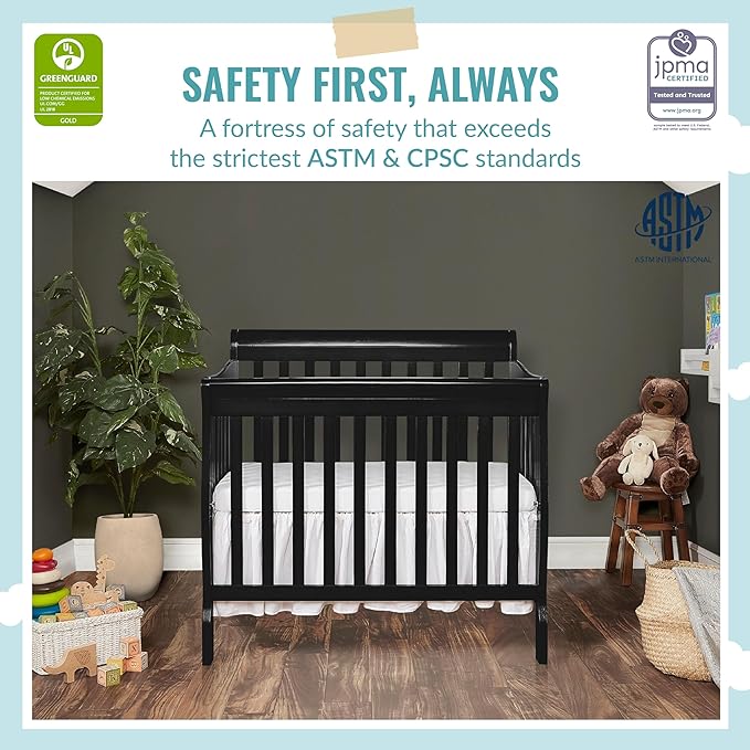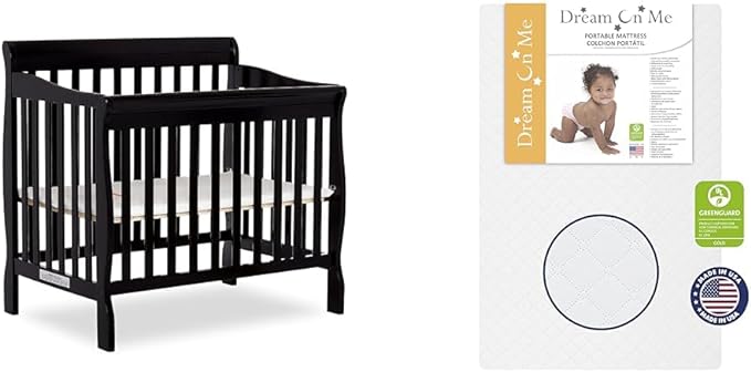 Aden 4-in-1 Convertible Mini Crib in Black, Greenguard Gold Certified, Non-Toxic Finish & Sunset 3” Extra Firm Fiber Crib Mattress, Greenguard Gold Certified