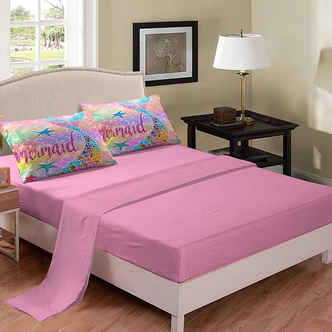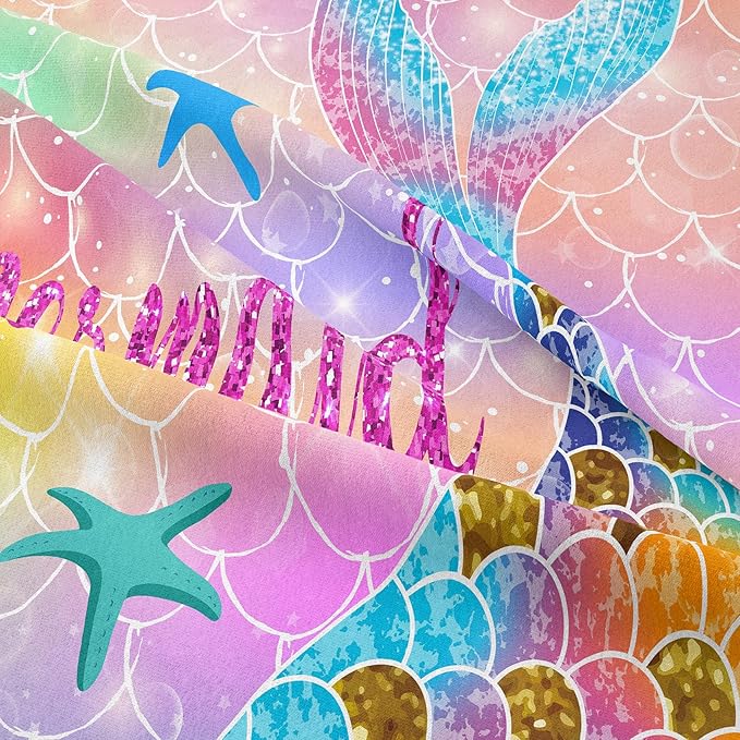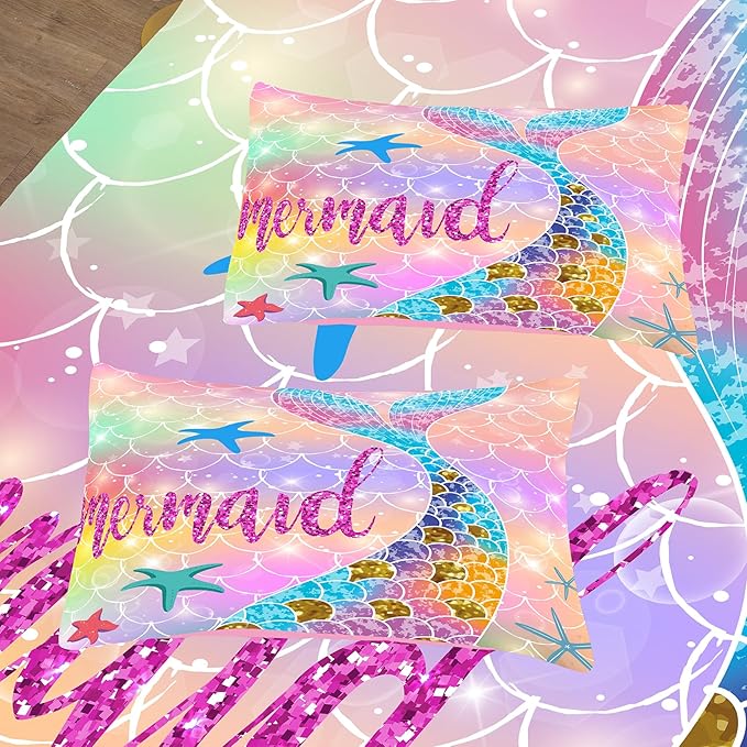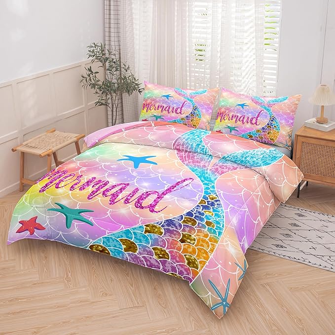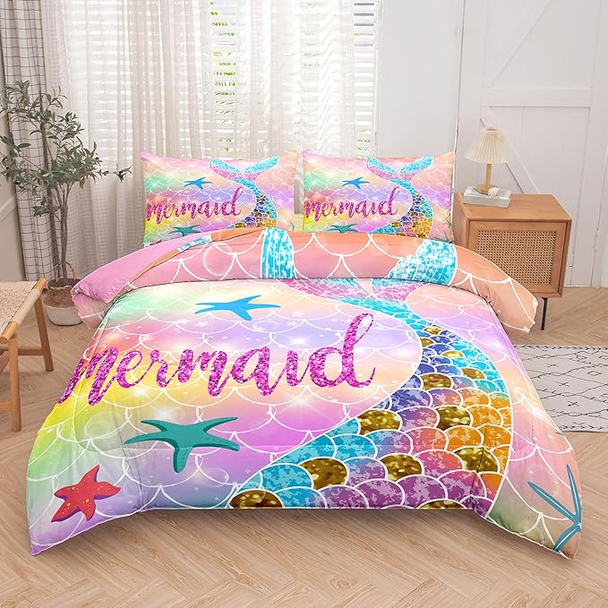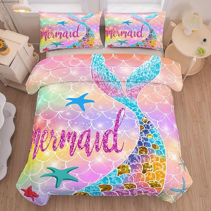 NINENINE Mermaid Comforter 5PCS Full Size Bedding Sets for Girls, Princess Comforter Sets for Girls, Glitter Bedding Set for Girls (1Comforter, 1Flat Sheet, 1Fitted Sheet, 2Pillowcases)