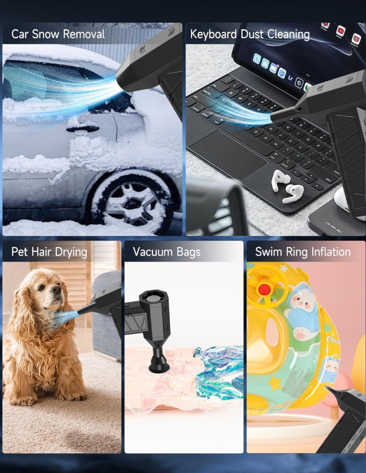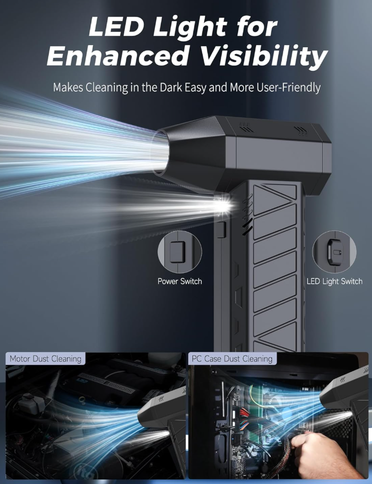 Compressed Air Duster Air Gun - Powerful Cordless Rechargeable 4-Gear Adjustable Air Blower with LED Lighting, for Computer, Keyboard, Car, Outdoor