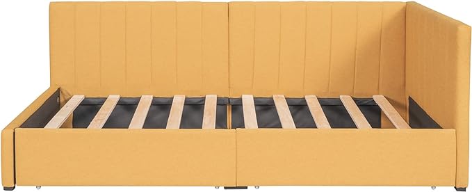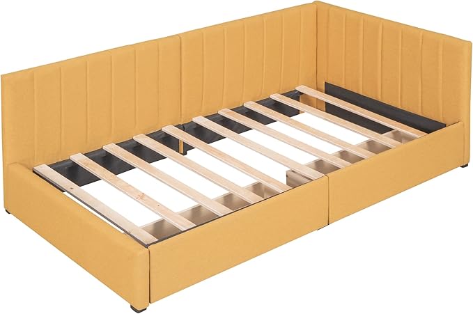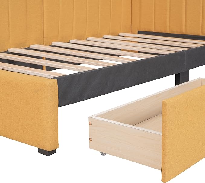 Twin Size Upholstered Daybed with Headboard and 2 Storage Drawers Underneath, Modern Linen Fabric Day Bed Frame for Bedroom/Living Room/Guestroom, Yello