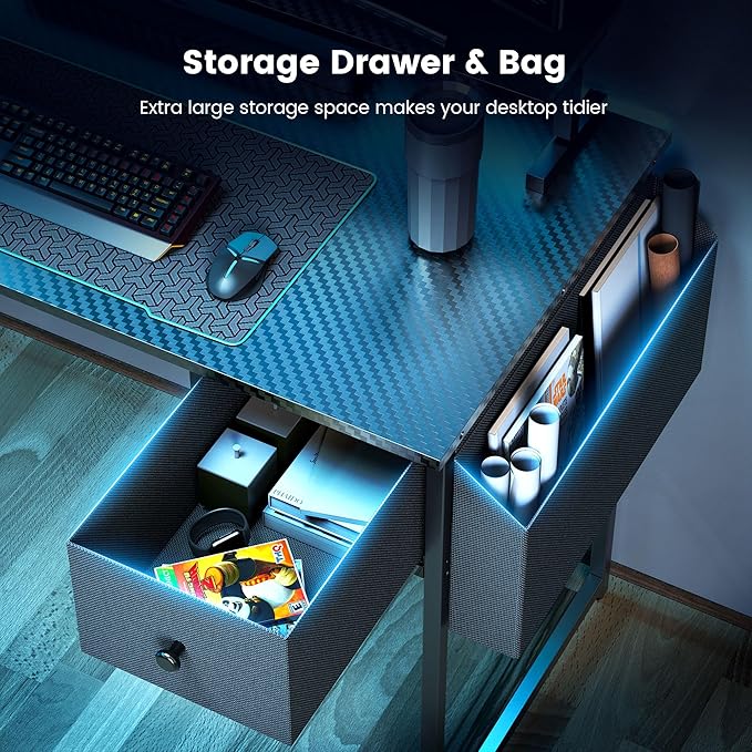 L Shaped Gaming Desk, 55 Inch Computer Desk with Adjustable Stand & RGB Lights, Corner Desk for Power Outlet, Carbon Fiber Texture, Gaming Room