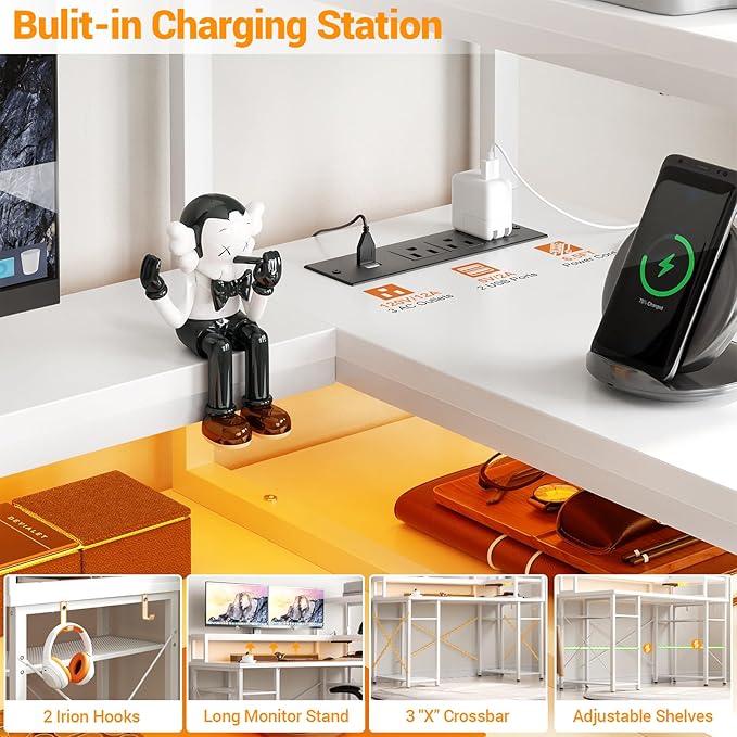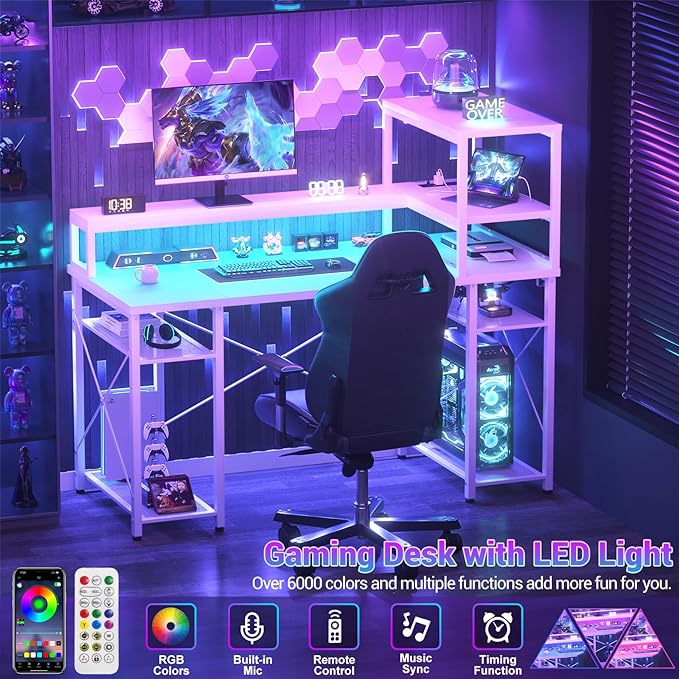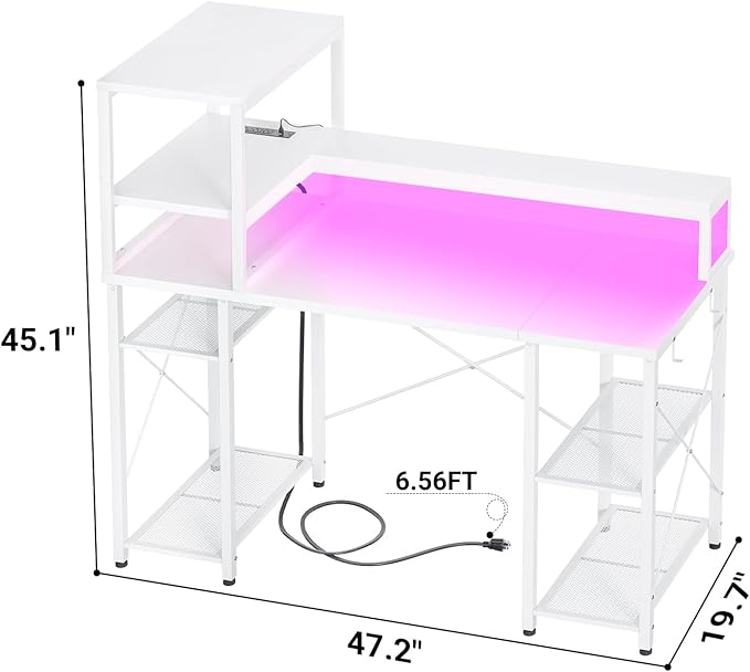 Cyclysio Gaming Desk with LED Light, 47 inch Computer Desk with Storage Shelves, Adjustable Home Office Desk with Power Outlets, Computer Gaming Desk with Long Monitor Stand for Small Space, White