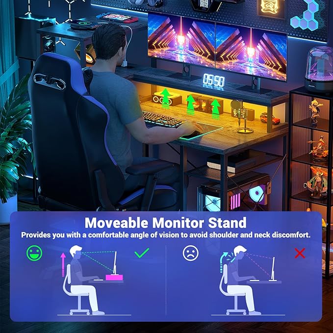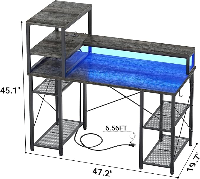 Cyclysio Gaming Desk with LED Light, 47 inch Computer Desk with Storage Shelves, Adjustable Home Office Desk with Power Outlets, Computer Gaming Desk with Long Monitor Stand for Small Space, Grey