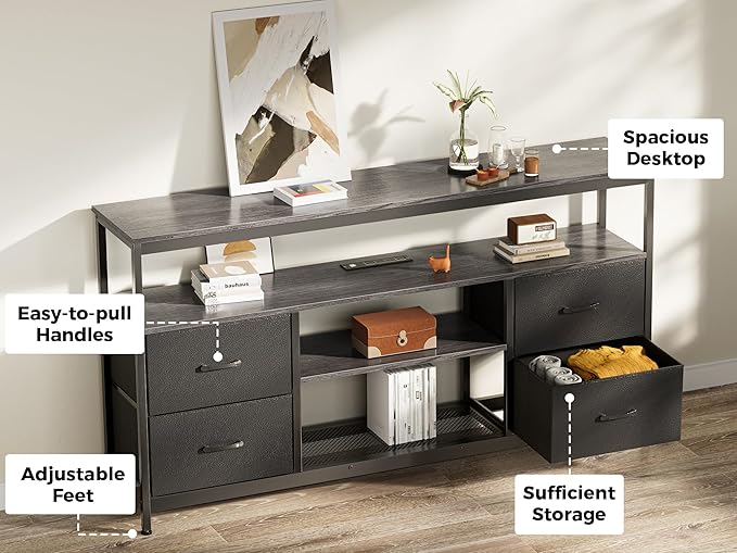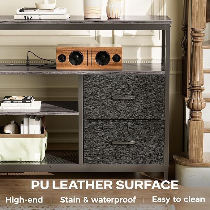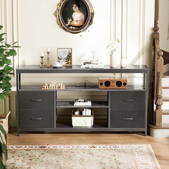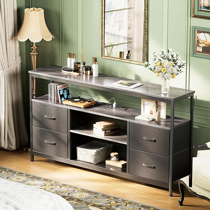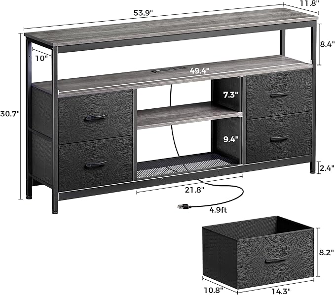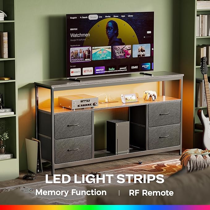 TV Stand Dresser with Power Outlets and LED Lights, 4 Drawers Entertainment Center with Shelves, 54in Media Console for 55 60 Inch TV, Dresser with PU Finish, Grey and Black