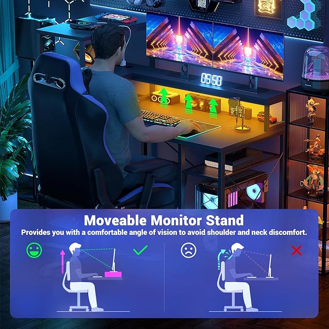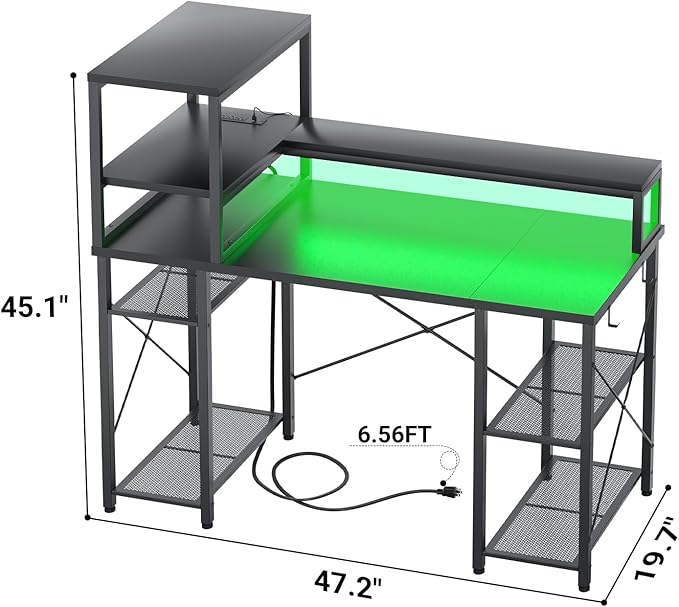 Cyclysio Gaming Desk with LED Light, 47 inch Computer Desk with Storage Shelves, Adjustable Home Office Desk with Power Outlets, Computer Gaming Desk with Long Monitor Stand for Small Space, Black