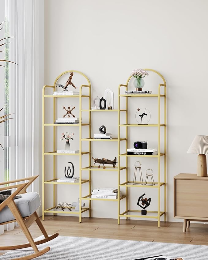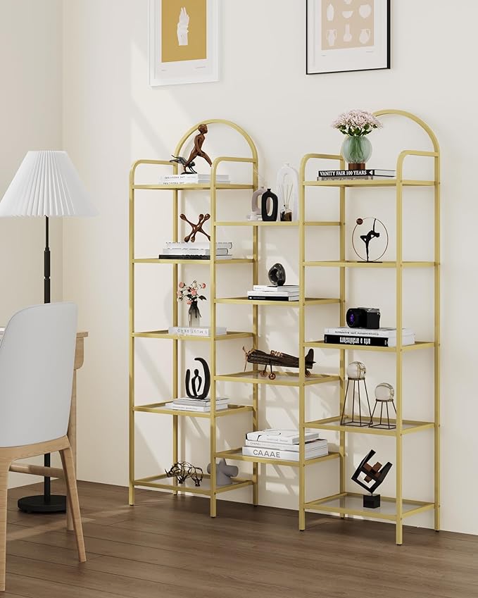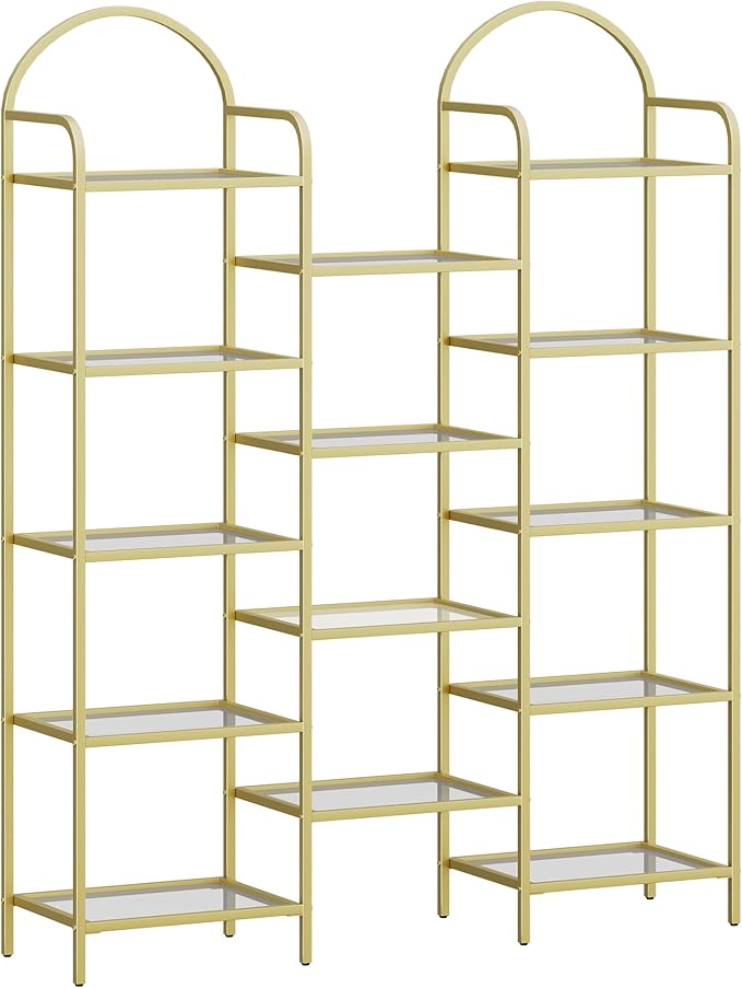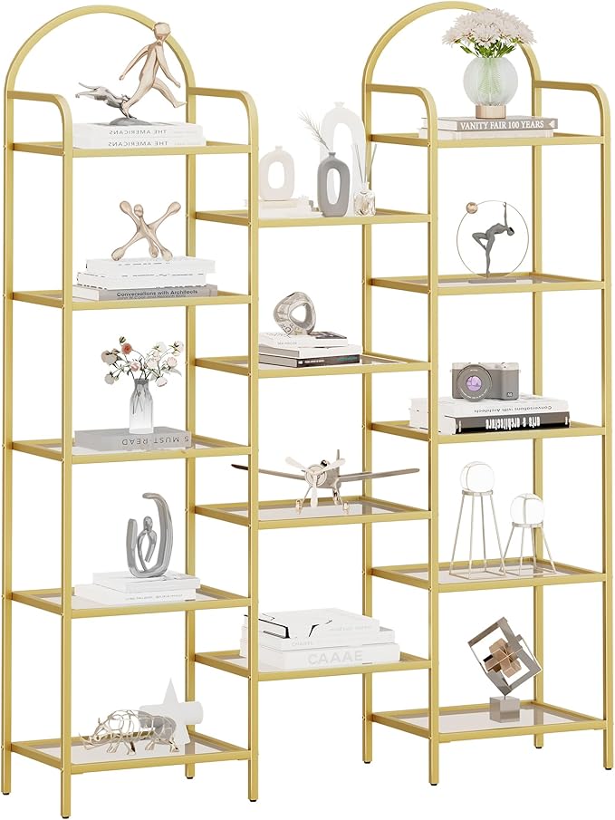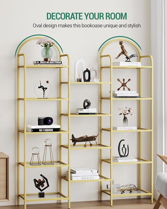 5 tier Bookcase Bookshelf, Tempered Glass Bookshelves, Triple Wide Glass Storage Rack with 14 Open Storage Spaces, Display Shelf for Living Room, Home Office, Bedroom, Gold BC50101G