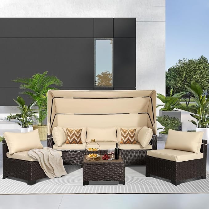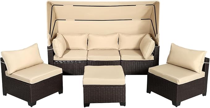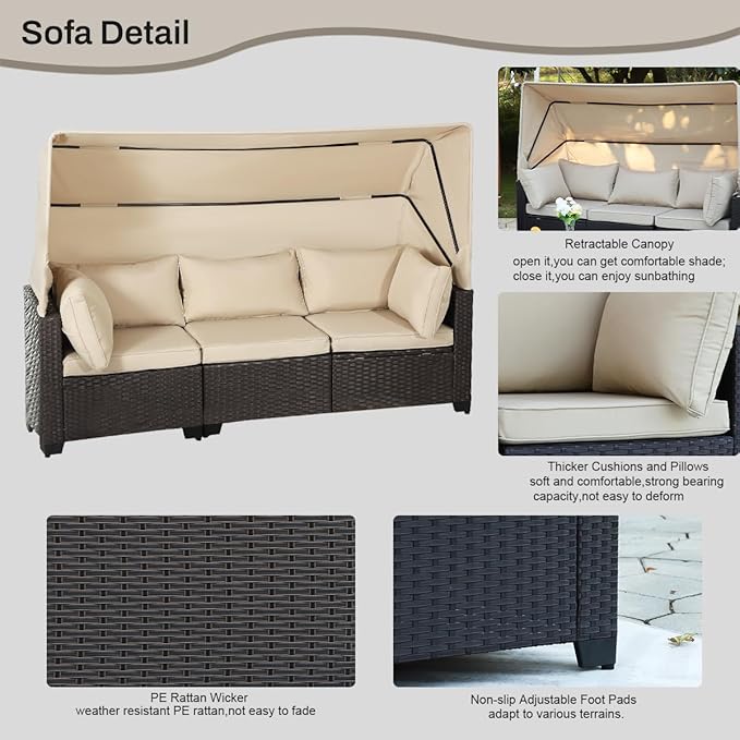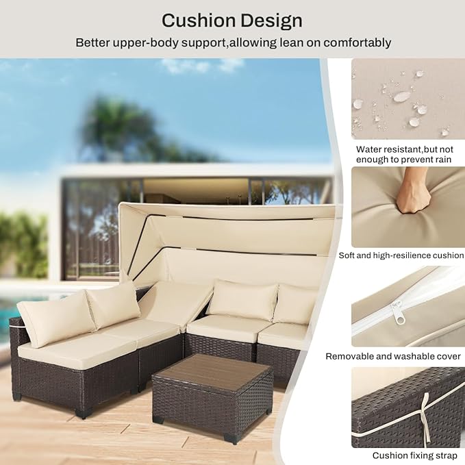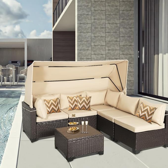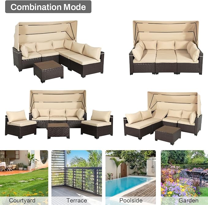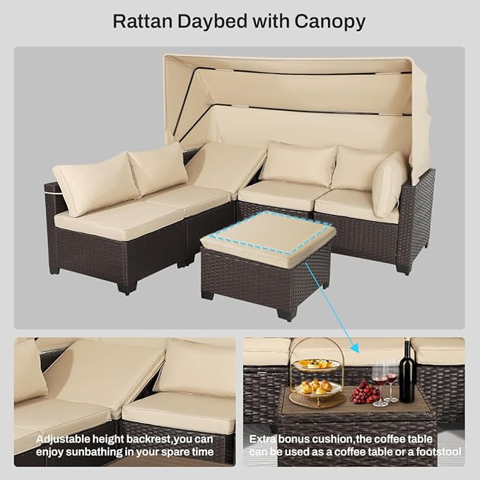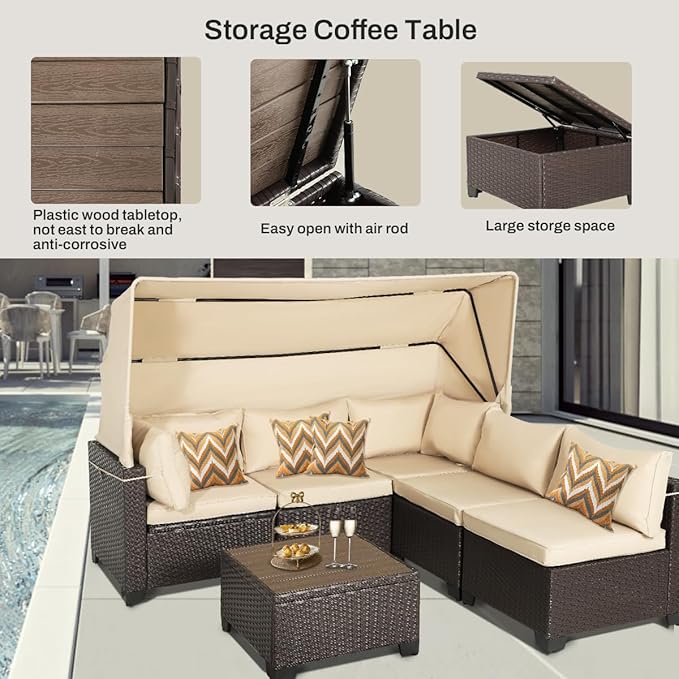 6 PCS Outdoor Patio Furniture Set,Sectional Sofa Set,Rattan Daybed with Retractable Canopy,Adjustable Backrest,Storage Coffee Table for Porch Garden Poolside Backyard(Khaki)