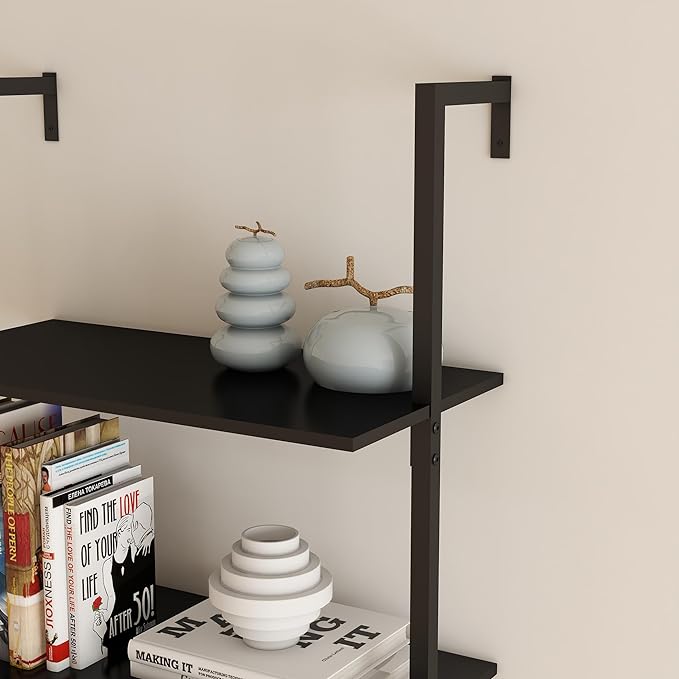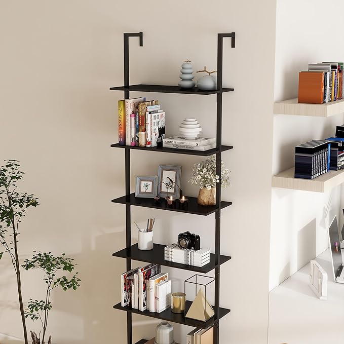 Panana 6 Tier Tall Modern Bookshelf, Industrial Ladder Shelf Open Space Wall Mount Bookshelf with Metal Frame Sturdy Bookcase for Living Room (Black, 6-Tier)