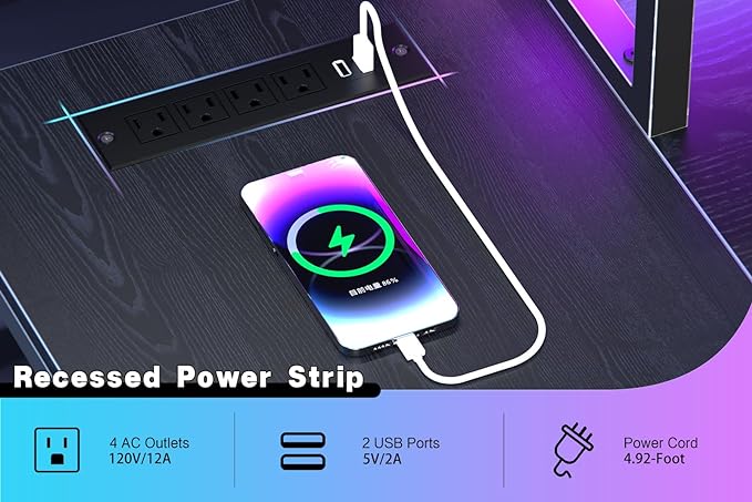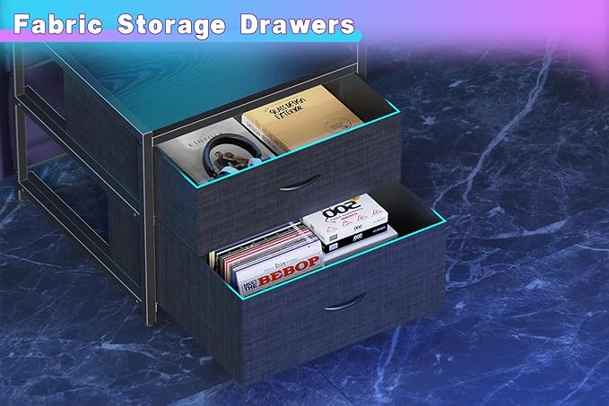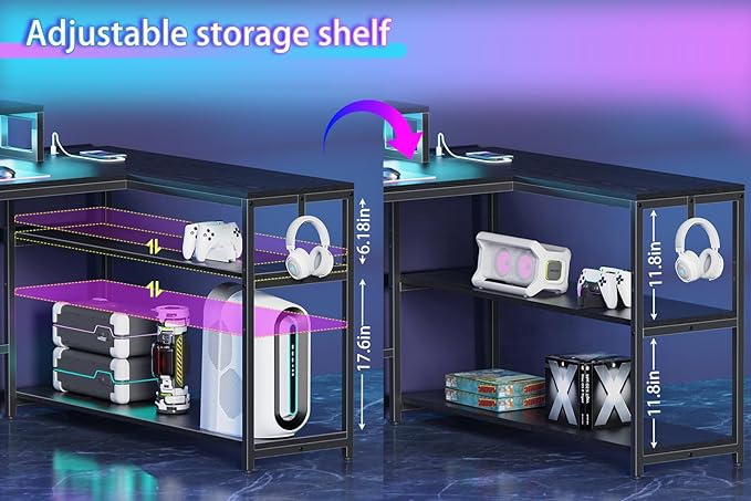 L Shaped Gaming Desk with File Drawes,Computer Desk with Led Lights & Power Outlets, Reversible Office Desk with Shelves Black