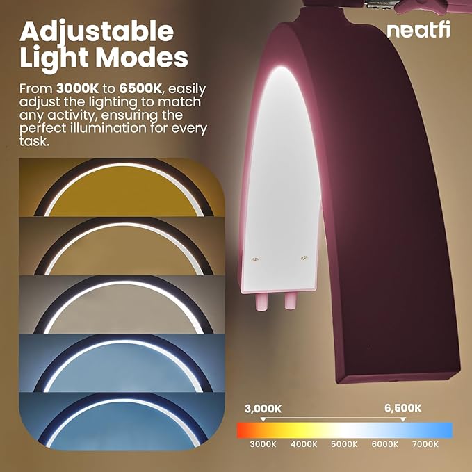 Neatfi Half Moon Swing Arm Table Lamp, 2500 Lumens, CCT Dimming, 5 Light Modes, Professional LED Lighting for Estheticians, Ideal for Nail Art, Facials, and Tattoos (with Base and Clamp, Pink)