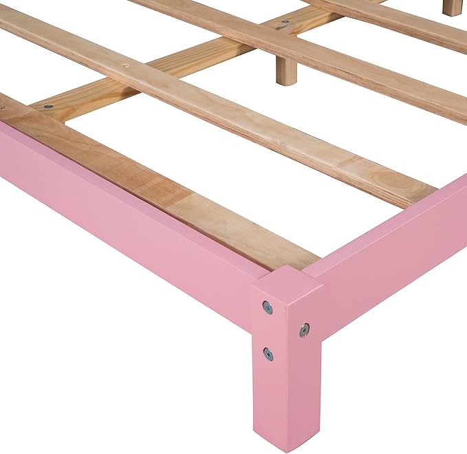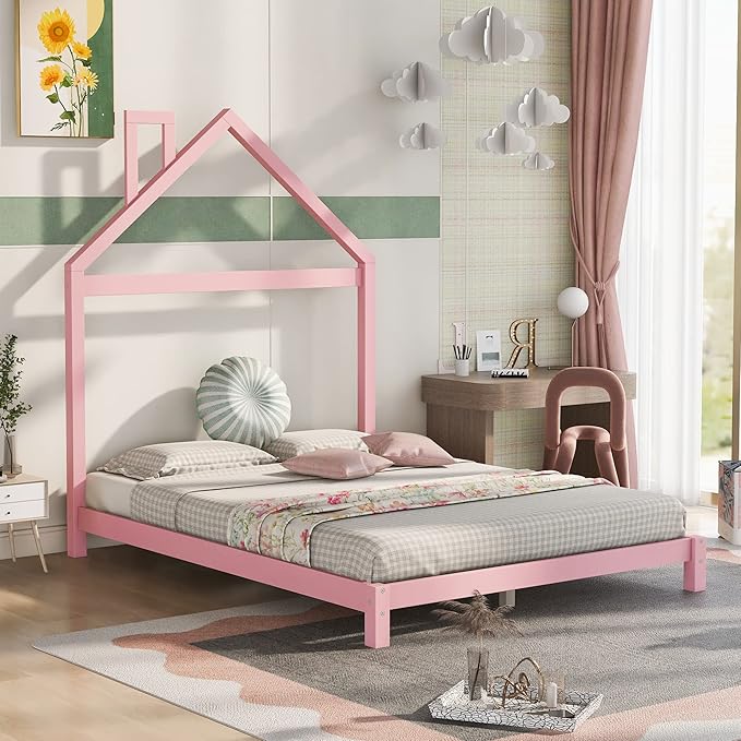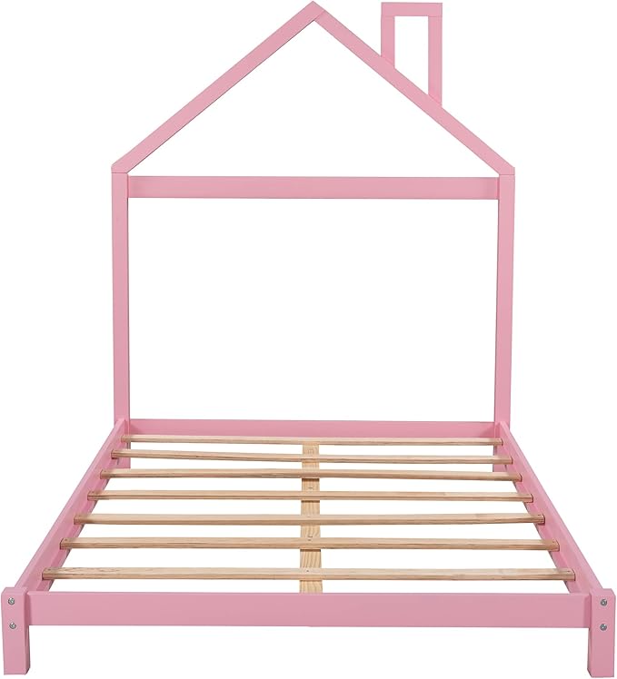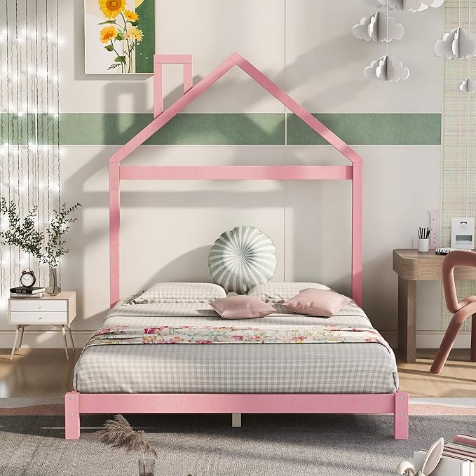 Jintop Full Size Wood Platform Chimney and House-Shaped Headboard,Bedroom Furniture Bed Frame W/ 10 Slat Support,Easy to Install,for Teens Kids Girls Boys,Pink