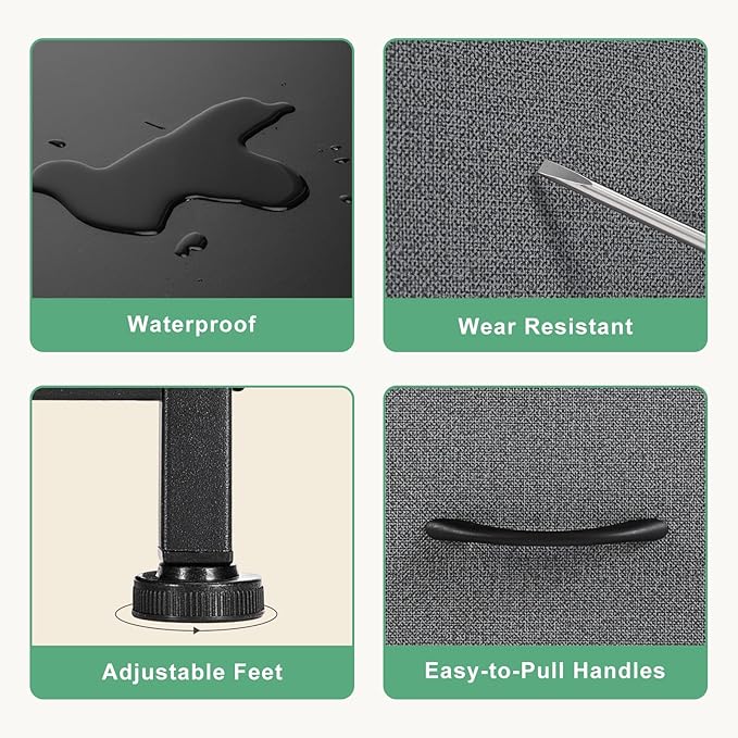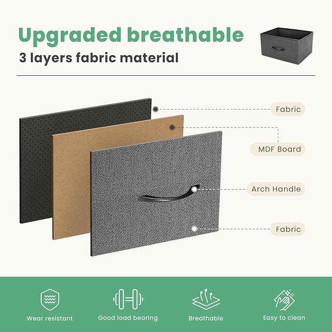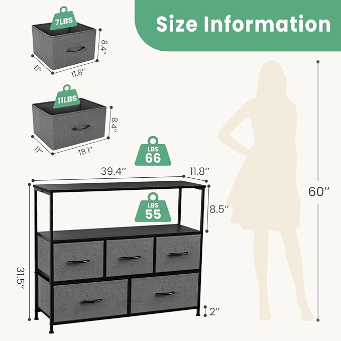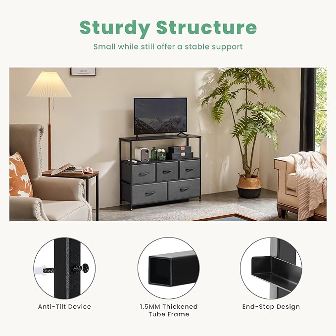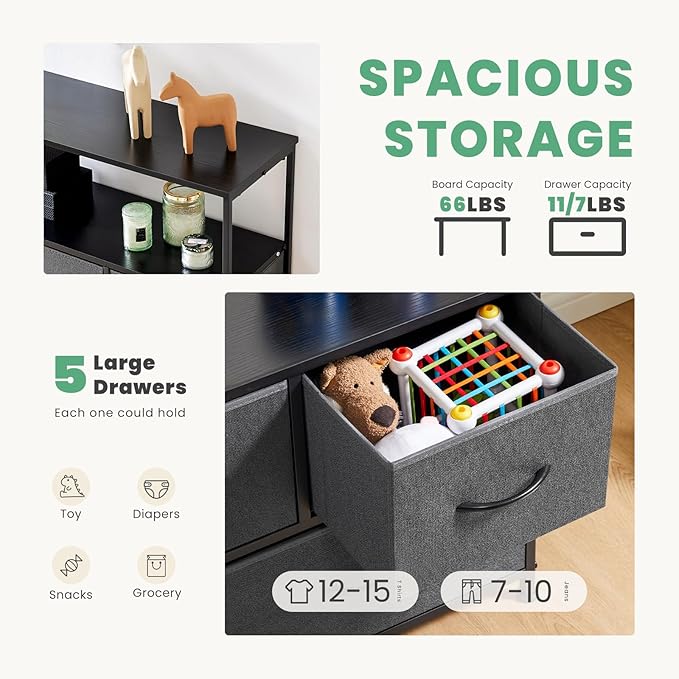 ANTONIA TV Stand Dresser for Bedroom with 5 Fabric Drawer, Entertainment Center for 45 inch Television, Media Console Table with Storage, Open Shelf, Adjustable Feet, Living Room Furniture, Grey