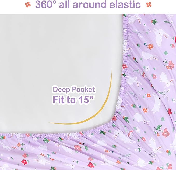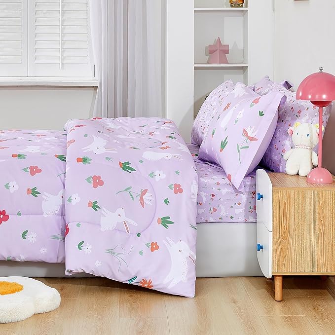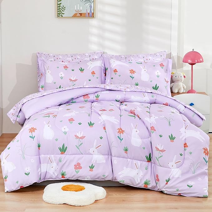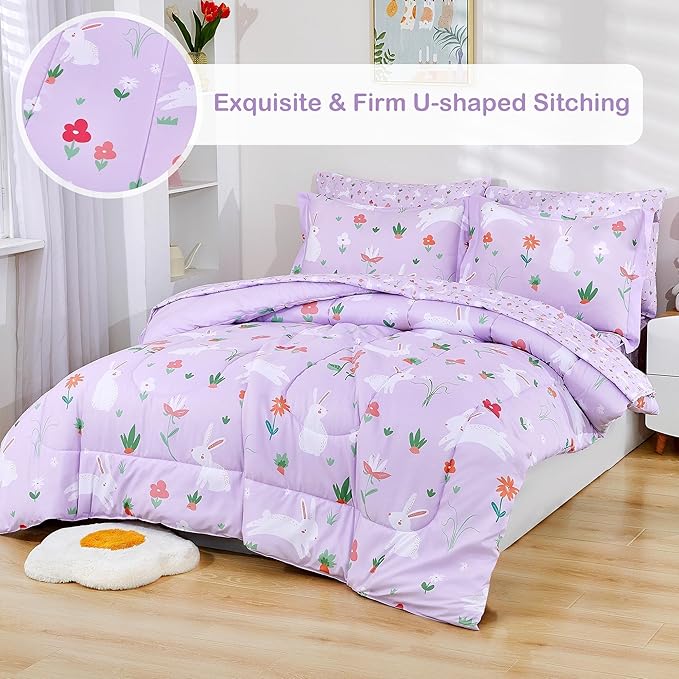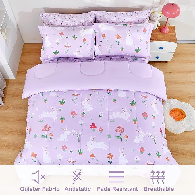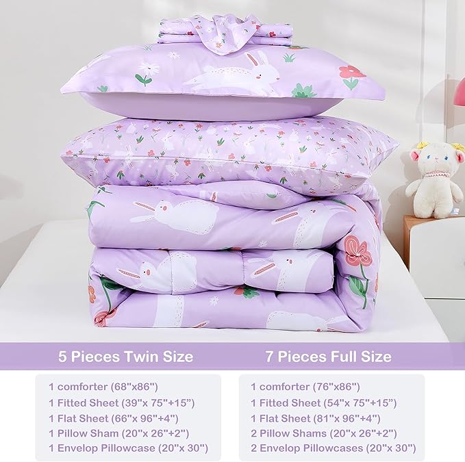 Mooreeke Bed in a Bag for Kids Girls Teens, 7 Pieces Full Size Comforter Bed Set with Shams, Sheet Set, Rabbit Purple Super Soft Microfiber Kids Comforter Bedding Set
