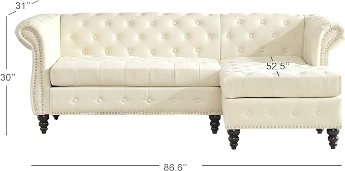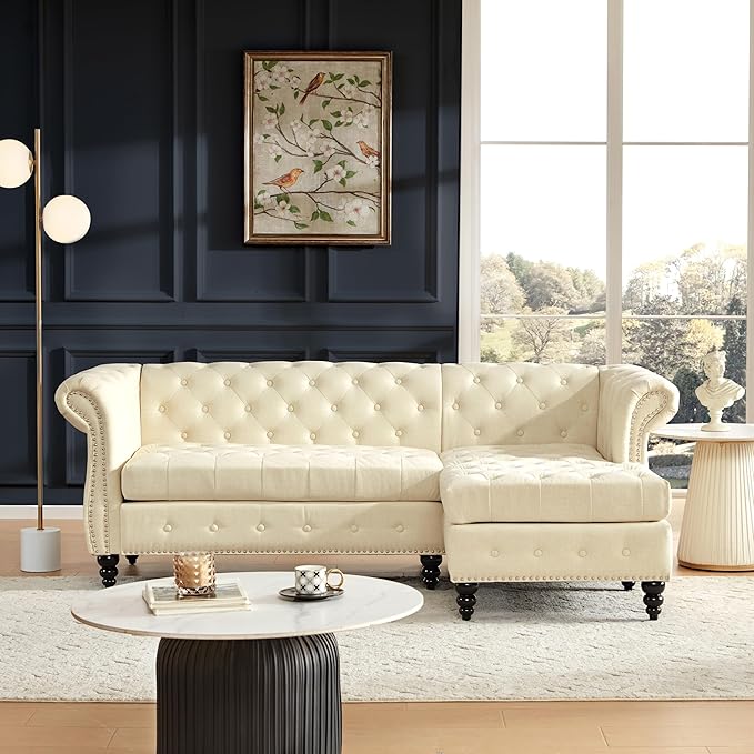 Tbfit L-Shape Sofa Couch with Chaise, Chesterfield Sofas with Nailhead Trim, Deep Button Tufted Sectional Couches for Living Room, Vintage Couches with Solid Wood Frame and Rolled Arms, Beige