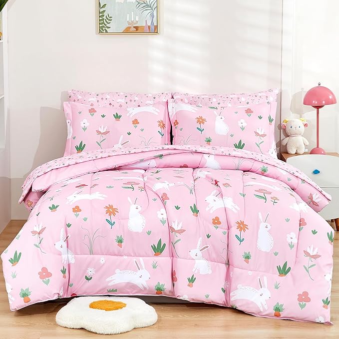 Mooreeke Bed in a Bag for Kids Girls Teens, 5 Pieces Twin Size Comforter Bed Set with Shams, Sheet Set, Rabbit Pink Super Soft Microfiber Kids Comforter Bedding Set
