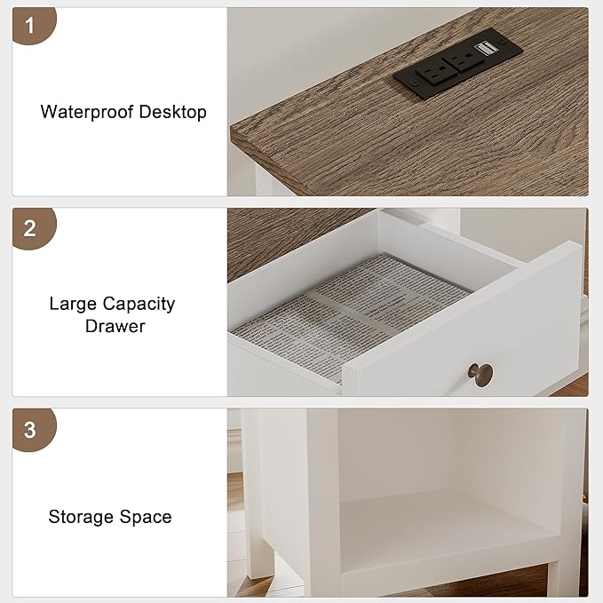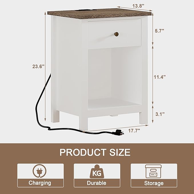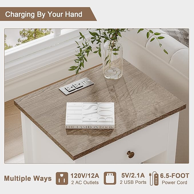 ChooChoo Farmhouse Nightstand Set of 2,Night Stand with Charging Station, Wooden Top Bedside End Table with Drawer and Storage Space for Bedroom, White