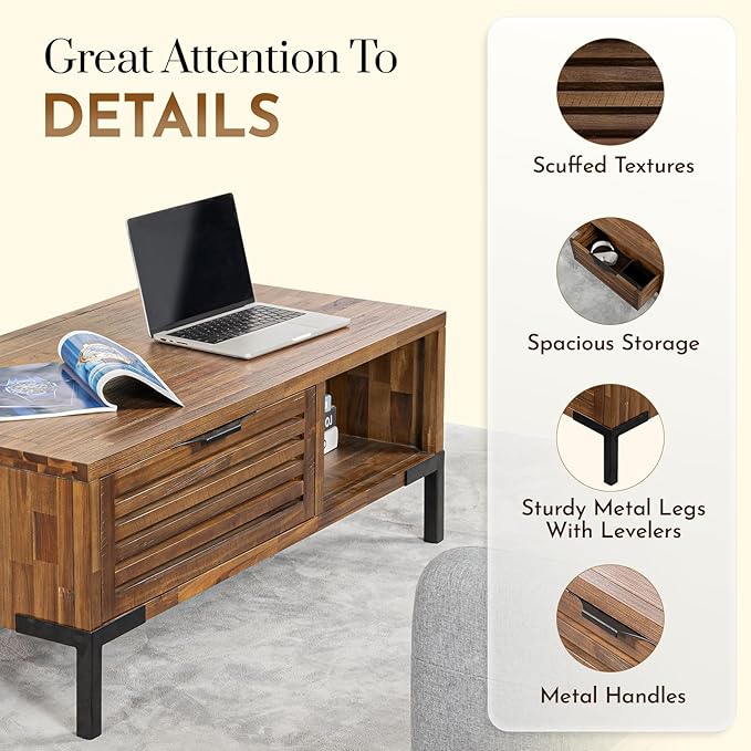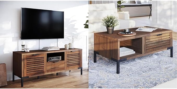 Bme, Millie Rustic TV Stand, Rustic Chestnut & Millie Solid Wood Coffee Tables, Industrial Modern Living Room Center Desk with 2 Storage Drawer