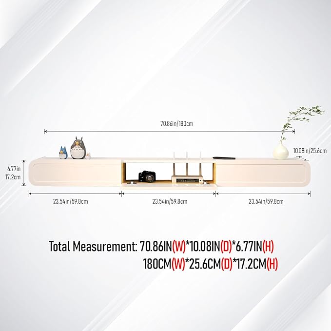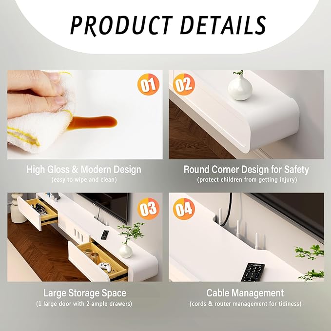 Floating TV Stand in Solid Wood, 71'' High Gloss Wall Mounted TV Cabinet, Floating TV Shelves with Door & Drawers, Modern Entertainment Media Console Center Large Storage Under TV