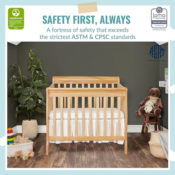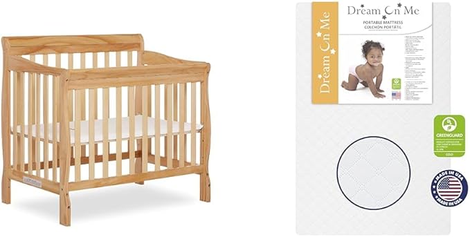 Aden 4-in-1 Convertible Mini Crib in Natural, Greenguard Gold Certified & Sunset 3” Extra Firm Fiber Crib Mattress, Greenguard Gold Certified, Waterproof Vinyl Cover