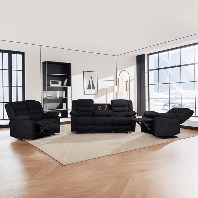 3 Pieces Oversized Manual Motion Set with Center Console,Cup Holders,Three Seaters Couch,Loveseat&Lounge Chair, Upholstered Reclining Sectional Sofa, Gray 3PIECES