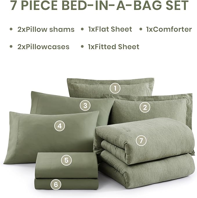 Monbix King Size Comforter Set, Sage Green King Size Bed Set Reversible, King Size Comforter Set 7 Pieces, Cationic Dyeing Bed in a Bag with Comforter, Sheets, Pillowcases & Shams