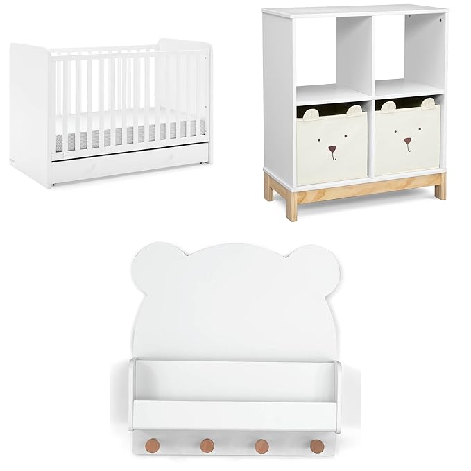 Delta Children babyGap Graham 4-in-1 Convertible Crib with Storage Drawer + Brannan Bear Bookcase with Bins + Brannan Bear Wall Shelf with 4 Hooks, Bianca White (Bundle)