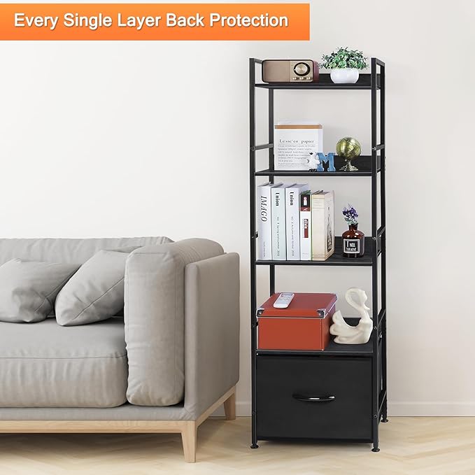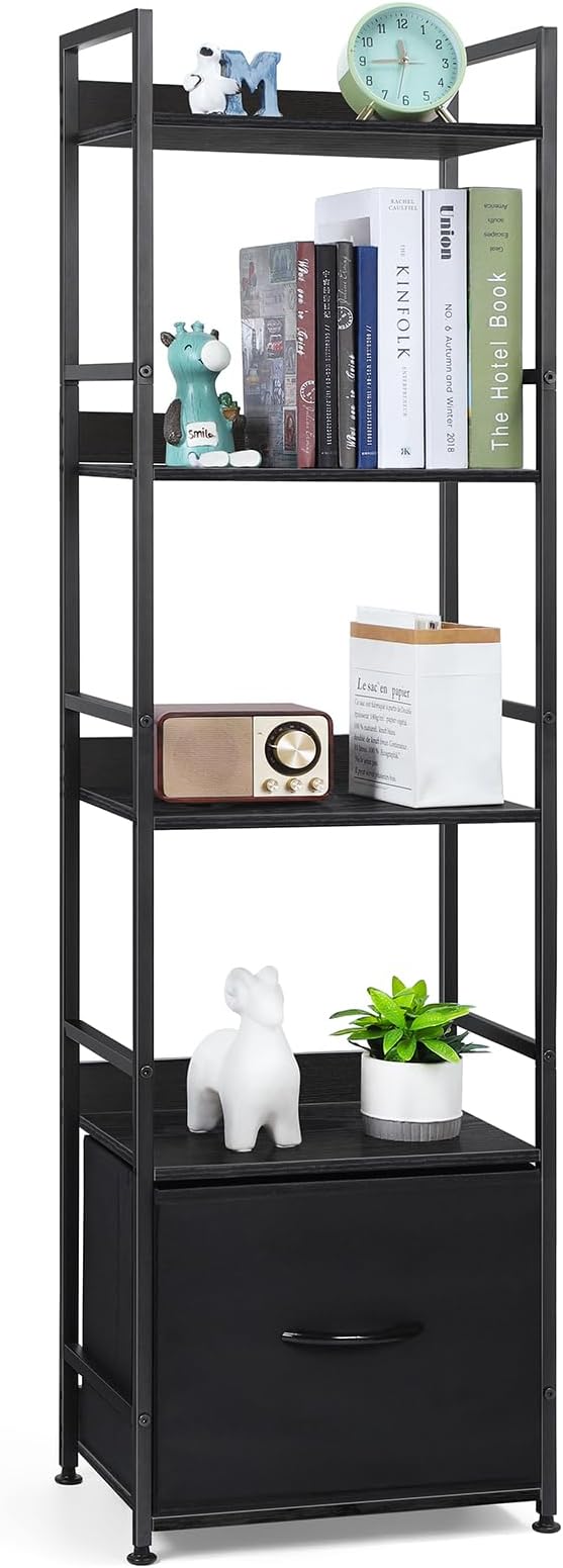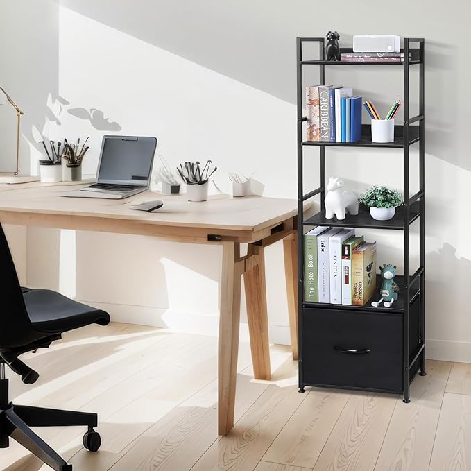 5 Tier Bookshelf with Storage, Bookcase with Drawers, Storage Shelves for Living Room / Home Office, Wood Shelves & Metal Shelf Organizer, Book Shelf for Bedroom, Tall & Ladder Bookshelf, Black
